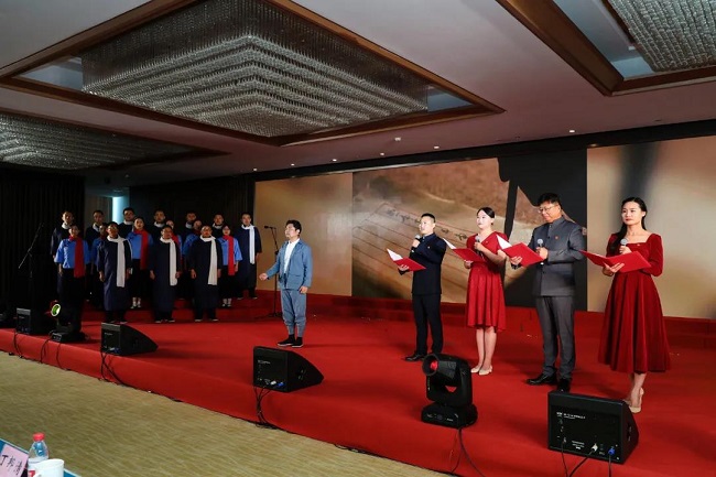 朗诵作品《光辉历程》《百年颂歌》,党员干部深情演绎,尽情诵读,配搭一幅幅经典画面,现场再现了党百年来波澜壮阔的发展历程。
