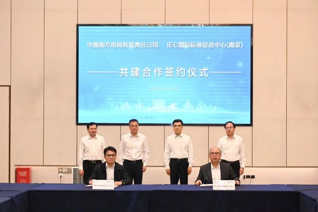 IEC国际标准促进中心(南京)(下称IEC中心)与中国南方电网有限责任公司(下称南方电网)签署共建合作协议。IEC第36届主席、中国工程院院士、中国电机工程学会理事长舒印彪,中国南方电网有限责任公司党组成员、副总经理唐屹峰,南京市人民政府副秘书长郑晓明、南京市麒麟科创园管委会主任樊向前共同见证协议签署。IEC中心主任范建斌与南方电网科技创新部总经理许树楷分别代表双方在协议书上签字。