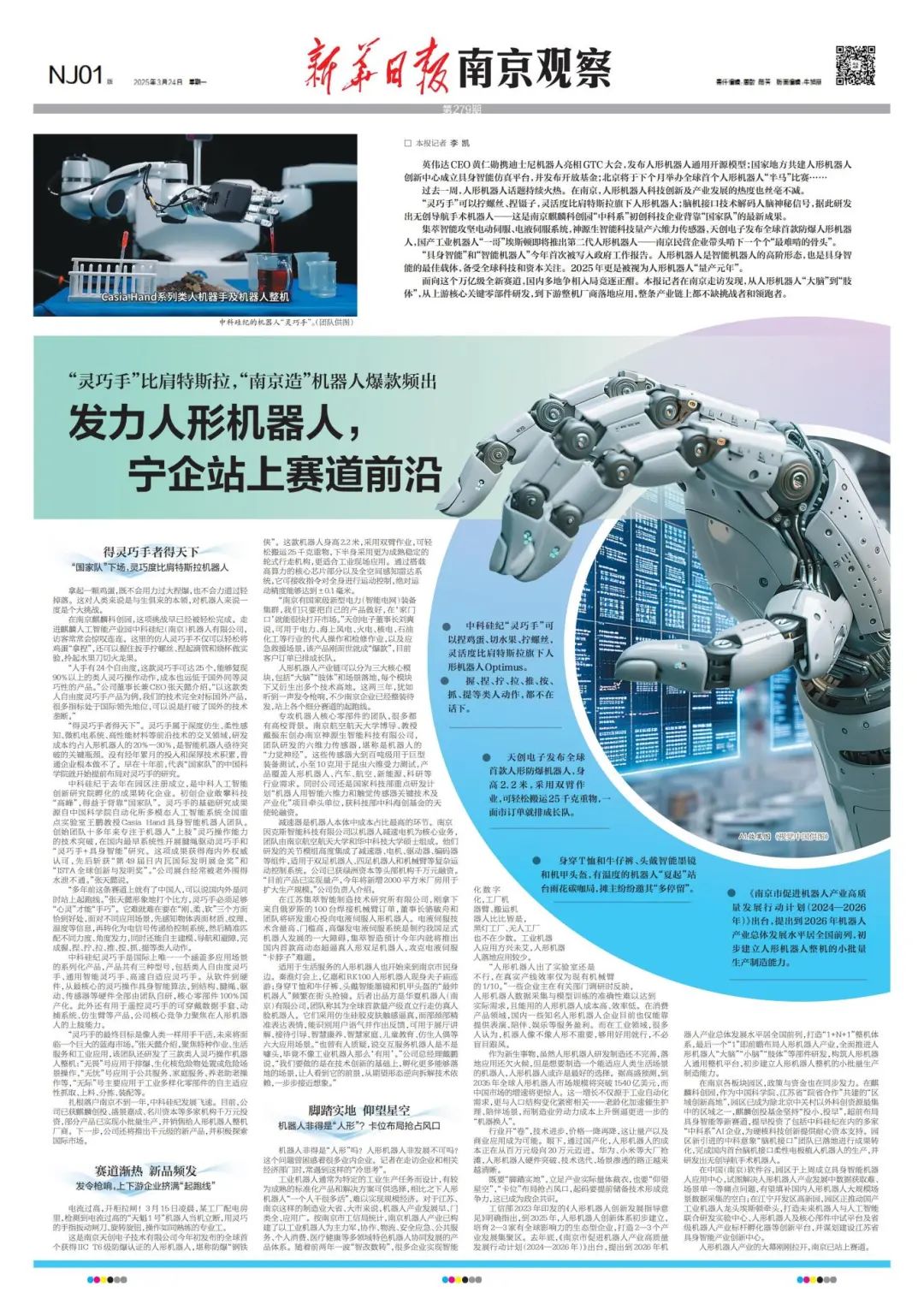 “具身智能”和“智能机器人”今年首次被写入政府工作报告。人形机器人是智能机器人的高阶形态,也是具身智能的最佳载体,备受全球科技和资本关注。2025年更是被视为人形机器人“量产元年”。面向这个万亿级全新赛道,国内多地争相入局竞逐正酣。本报记者在南京走访发现,从人形机器人“大脑”到“肢体”,从上游核心关键零部件研发,到下游整机厂商落地应用,整条产业链上都不缺挑战者和领跑者。