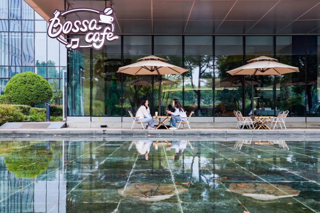 从政务服务中心出来,踏上由落叶铺就的小径,水池边的倒影正是Bossa Cafe的标志。醇香咖啡、诱人甜点、精致简餐,宽敞的座位、周到的服务,都是园区人最熟悉的感觉。半露天的座位最容易出片,秋日暖阳洒在身上,如同温柔的拥抱。来杯招牌咖啡,这里是思考与放空的完美场所。