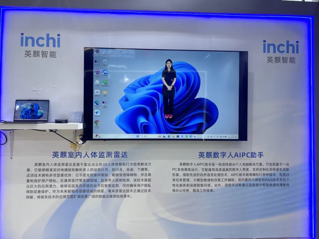 南京英麒智能科技有限公司展出英麒数字人AIPC助手和英麒室内人体监测雷达。英麒室内人体监测雷达将毫米波雷达与人工智能技术创新性结合,具有低成本、小型化、无需光照、不侵犯隐私等优点,可实现室内场景中对人体的姿态判断、跌倒检测、存在检测、呼吸与微动状态检测,监测数据全程可追溯。英麒数字人AIPC助手配备逼真数字人界面,支持定制且能快速生成新形象,借助自然语言处理技术精准执行指令,涵盖日常任务管理、大模型推理与创意工作辅助等,内置大模型与RAG技术实现个性化服务与深度智能问答,语音指令还可快速处理邮件等办公事务,大幅提升工作效率。
